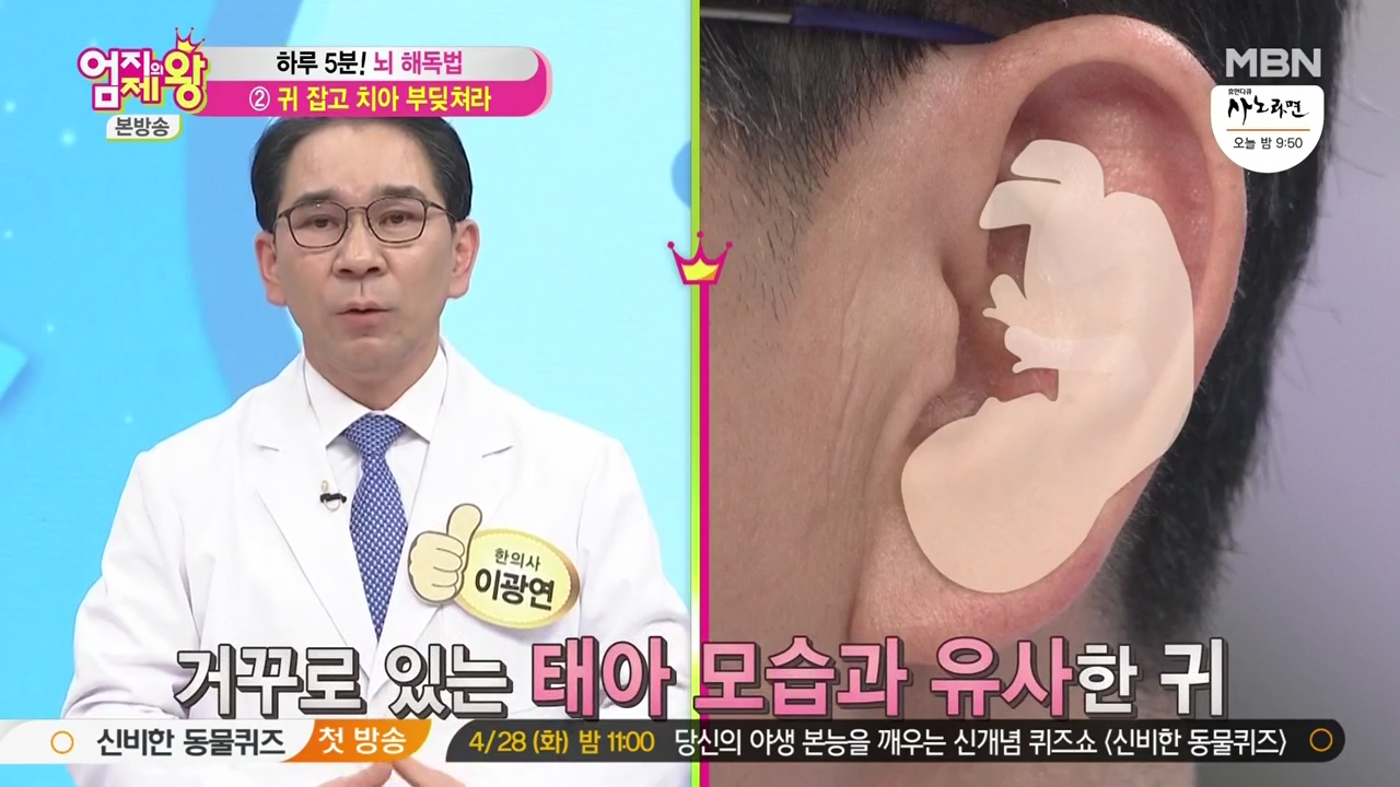 한의학 문헌인 <황제내경>을 보면 귀에는 우리 몸의 각 경락이 연결되어 있다고 기록되어 있는데요, 뇌와 연결된 귀 혈 자리를 지압하면서, 치아를 부딪치면, 뇌 해독과 치매 예방 효과를 두 배로 볼 수 있습니다.