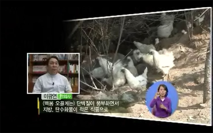 동의보감에서는 털이 희고 뼈가 검은 닭, 즉 백봉오골계가 특히 좋다고 하면서, 정신적 충격, 놀란 것을 치료하고, 오장을 편안하게 하고 소갈을 멎게 하며, 소변을 잘 통하게 해주는 효과가 있다고 설명합니다. 풍습에 의한 질병에 특히 좋고, 몸이 허약한 체질을 건강하게 해주는 보약인데요.