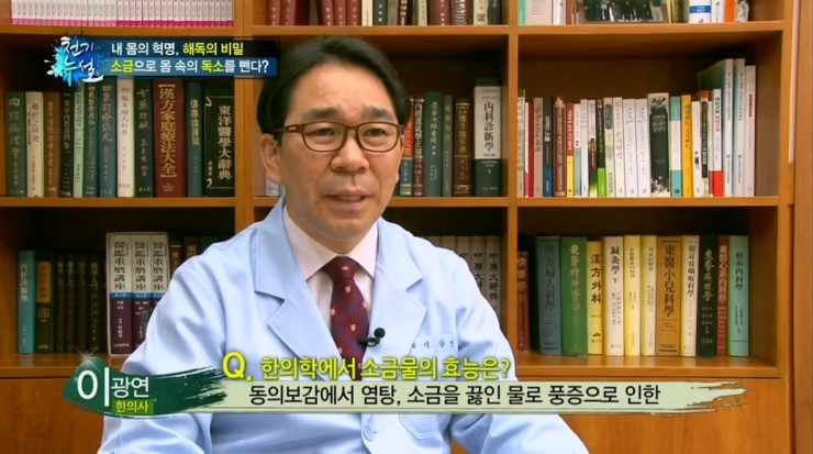 동의보감에서는 염탕, 즉 소금을 끓인 물로 풍증으로 인한 가려움증을 치료한다고 기록되어 있습니다. 특히 벽해수라고 하여, 바닷물을 이용하면 더욱 효과가 좋다고 되어 있는데요. 이것은 삼투압의 성질을 이용해서 피부의 노폐물을 제거하고, 따뜻한 물로 목욕을 해서 순환을 촉진하는 방법입니다.
